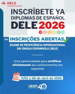 A Universidade Estadual do Piauí (UESPI), por meio do Departamento de Línguas (DL) e em parceria com o Núcleo de Exame de Proficiência (NEP), anunciou a abertura das inscrições para o Exame de Proficiência Internacional em Língua Espanhola (DELE) 2026. O exame, aplicado pelo Instituto Cervantes, é reconhecido oficialmente pelo Ministério da Educação, Cultura e Esportes da Espanha e certifica o nível de competência linguística de candidatos em língua espanhola.